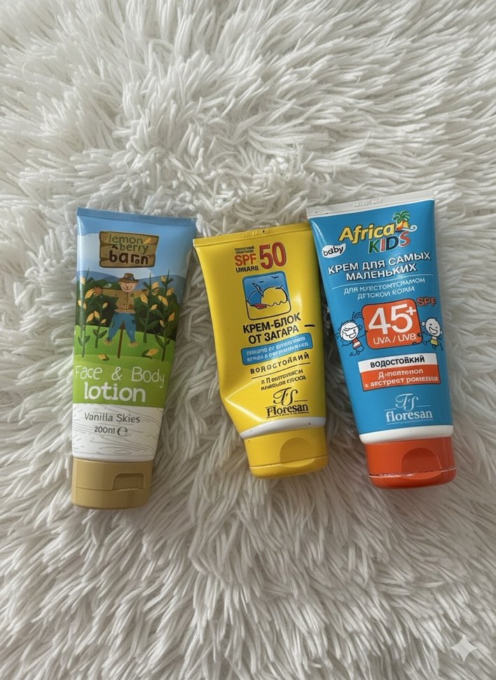 İhtiyaç fazlası olduğu için satışa sunduğum, hem yetişkinler hem de çocuklar için uygun güneş koruma ve bakım setidir. Set içerisinde; Lemon Berry Barn Face & Body Lotion (yüz ve vücut losyonu), Floresan SPF 50 güneş koruyucu krem ve çocuklar için özel üretilmiş Africa Kids SPF 45+ güneş kremi bulunmaktadır. Ürünlerin tamamının son kullanma tarihleri (SKT) geçmemiştir, güvenle kullanılabilir. Her bir ürünün güncel doluluk oranını şeffaf bir şekilde belirtmek için paketlerin üzerine siyah çizgi ile işaretleme yaptım. Lemon Berrry tamamen dolu