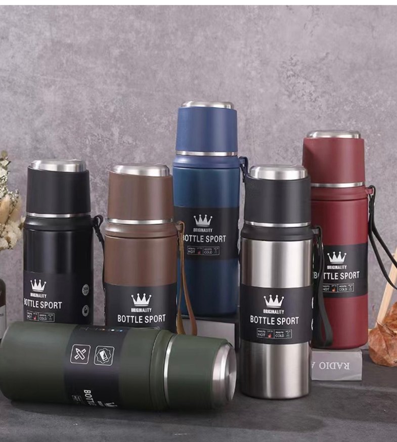 Çocuklar için haki ve gri renklerde spor termos şişe. Dayanıklı tasarım, güvenli kapak ve taşıma kayışı içerir. İçerikleri saatlerce sıcak veya soğuk tutar. sıfır termos