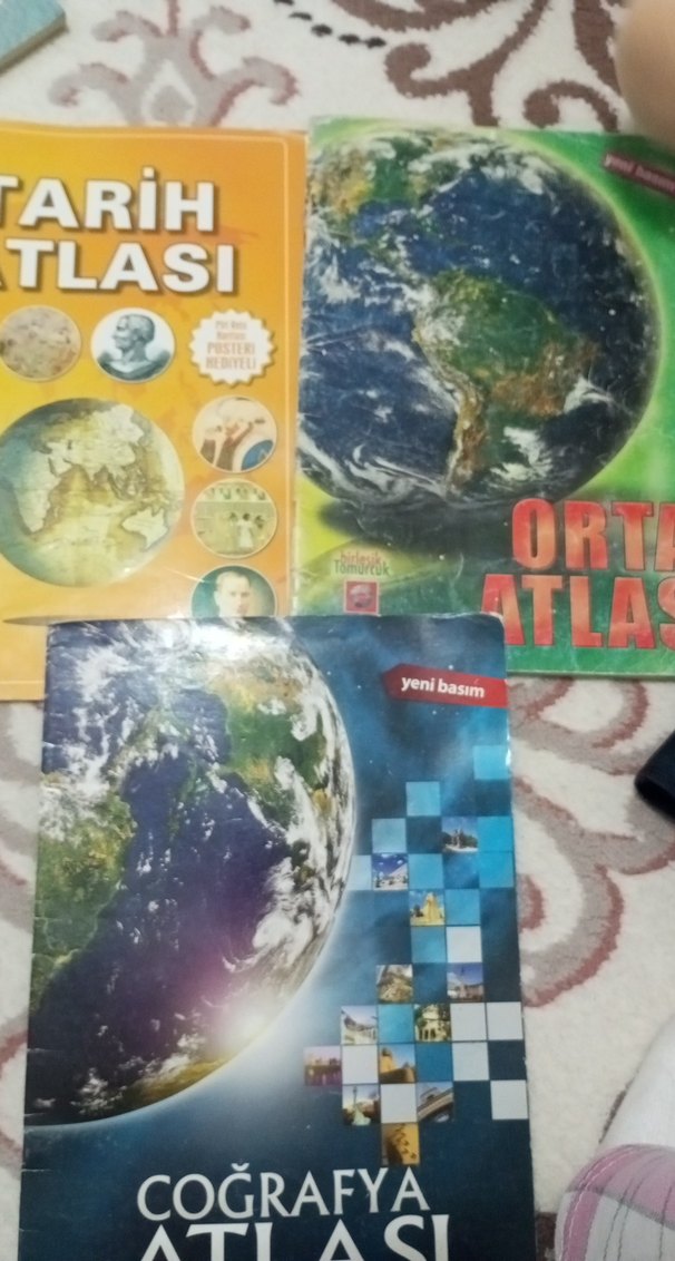 Çocuklar için üç adet yeni basım tarih atlası seti, renkli haritalar ve görseller içerir. Dünya ve tarih hakkında öğretici bilgiler sunar.