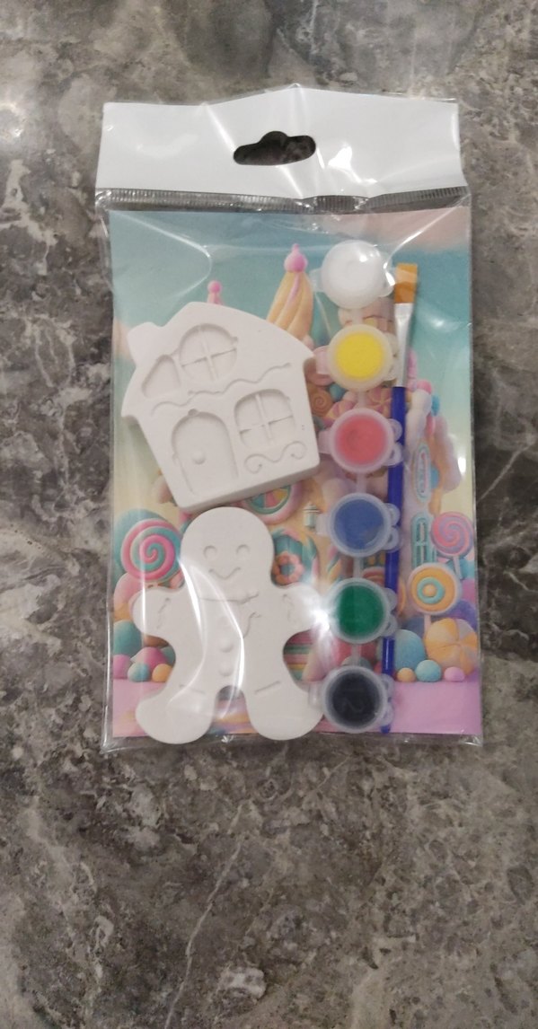 Pastel renklerde boyalar ve ev ile zencefilli adam figürlerinden oluşan çocuk boyama seti. 2 adet taş figür , 6lı boya 1 adet fırça evde çocukların yetişkinlerin kaliteli vakit gecireceği hobi seti