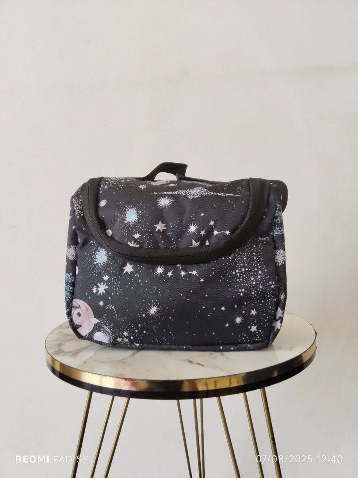 Yıldız ve gezegen desenli siyah çocuk okul çantası. Kompakt ve taşınması kolay, günlük okul kullanımı için uygun. Termo beslenme çantası