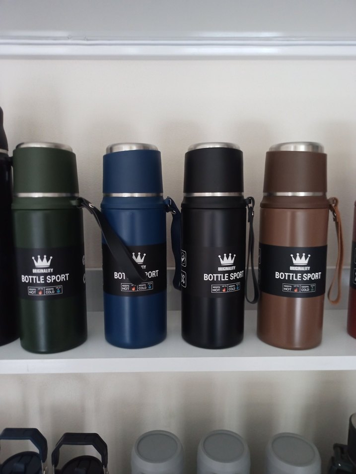 Spor tasarımlı, dayanıklı kayışlı ve içecekleri sıcak veya soğuk tutan yalıtımlı, koyu haki renk çocuk termos şişesi.
