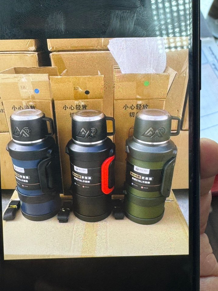 Çocuklar için koyu haki renk termos şişeler, saplı ve kapaklı, içecekleri sıcak tutar. Farklı sap renkleri mevcuttur.