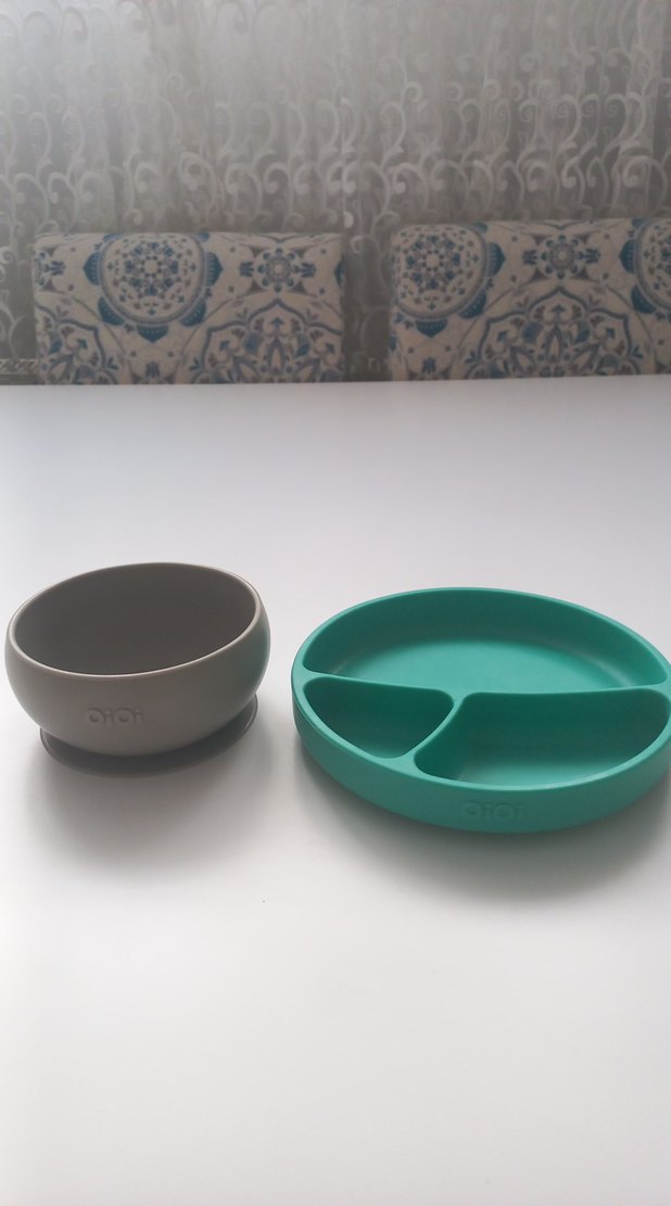 Turkuaz renkli bölmeli tabak ve gri kase, çocuklar için dayanıklı malzemeden üretilmiştir, yuvarlak kenarlara sahiptir. ️