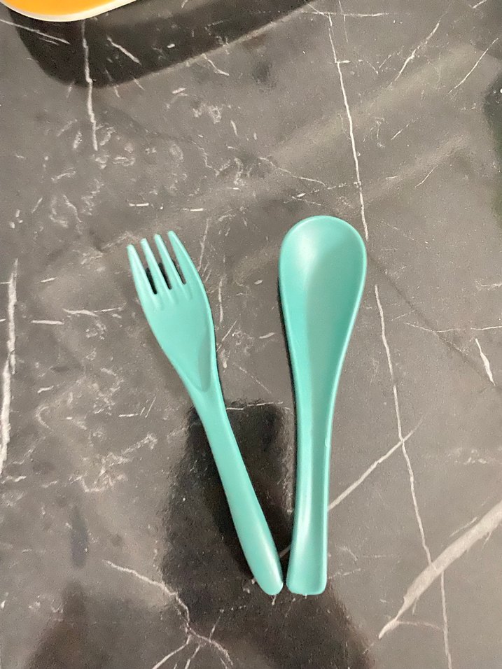Çocuklar için yumuşak, kullanışlı malzemeden yapılmış pastel turkuaz çatal ve kaşık seti.