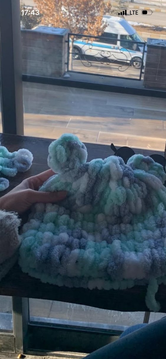 Pufi yünden yapılır çocuk ve yetişkinlere yapılır boy ve ölçülere göre yapılır renk seçimi ve ölçülere göre sipariş verebilirsiniz. Aynı ipten battaniye de yapılır. Yumuşak yün kumaştan yapılmış, pastel turkuaz bağlama desenli çocuk battaniyesi, sıcak ve rahat bir dokunuş sunar.