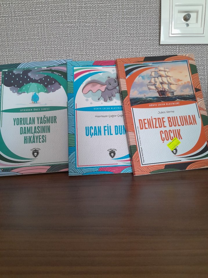 Çocuklar için yorgun yağmur damlası, uçan fil ve denizde bulunan çocuk hikayeleri içeren üç yabancı dil kitabı.