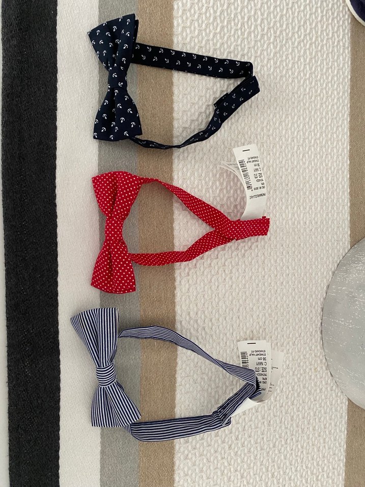 Çocuklar için üçlü sentetik kumaştan, desenli, çok renkli ve açık tonlarda papyon seti.
