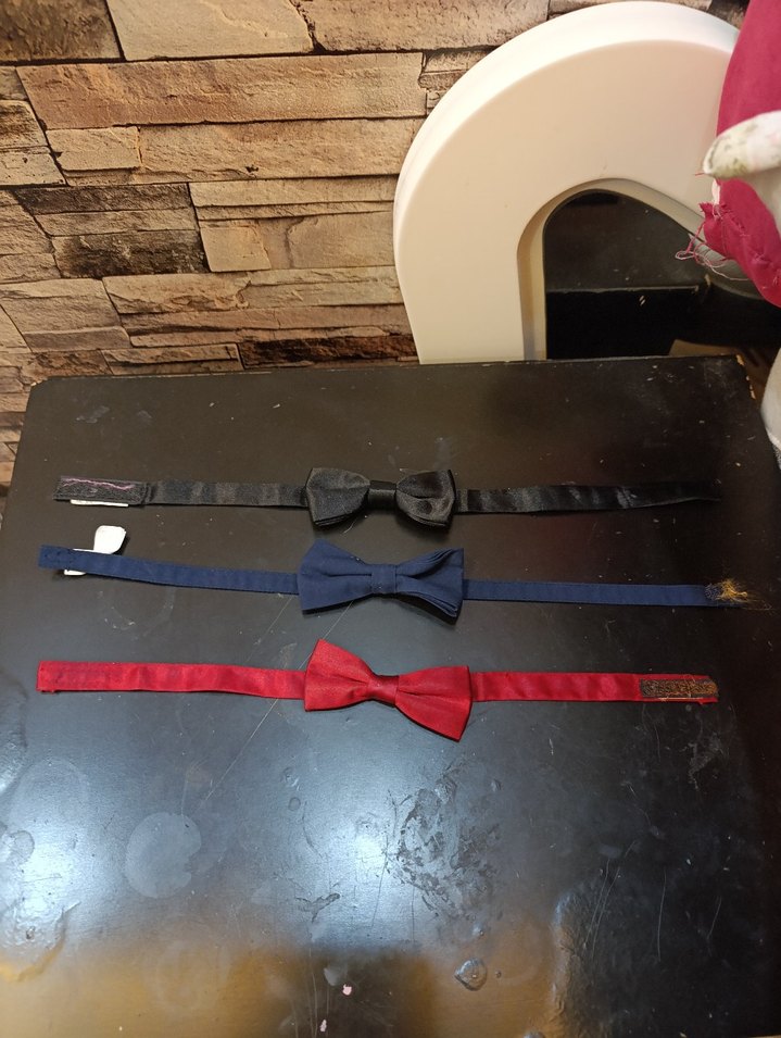 Sokak tarzına uygun, sentetik kumaştan yapılmış, koyu renklerde üçlü papyon seti. UZUNLUK 43