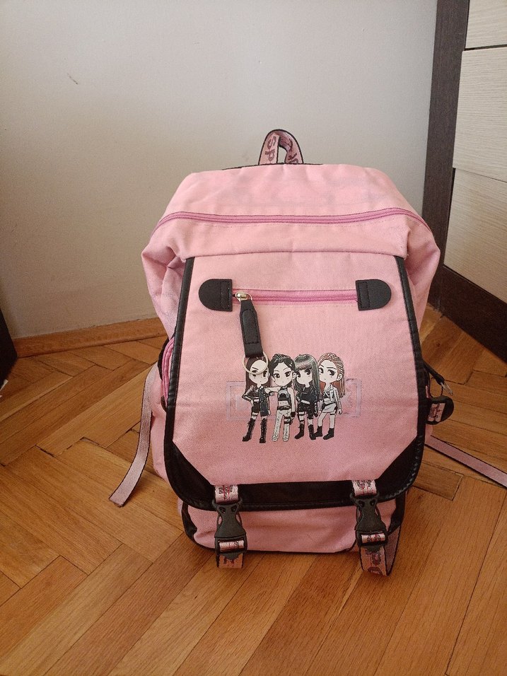 Blackpink sembolü pastel pembe renkte, ön cepli ve desenli çocuk okul çantası, ayarlanabilir askılarla rahat kullanım sağlar.