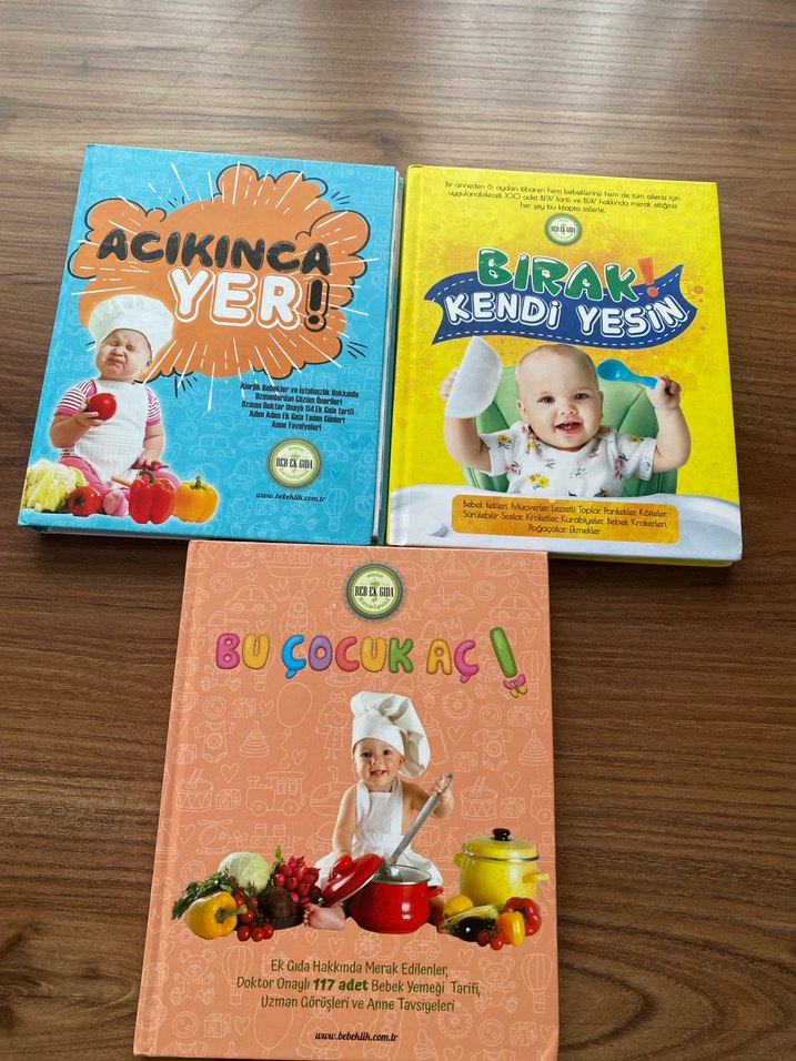 Beslenme ve yemek üzerine renkli kapaklı üç çocuk kitabı seti, bebek ve yiyecek temaları içerir.