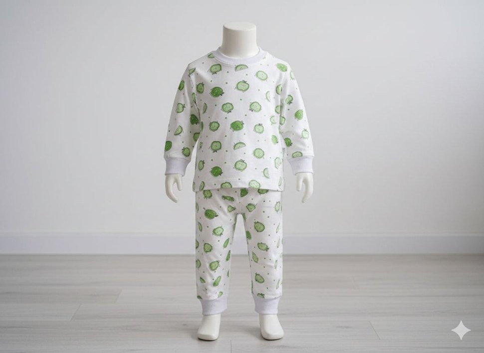 Çocuklar için yumuşak ve sıcak kumaşlı, beyaz zemin üzerine yeşil meyve desenli pijama takımı. Uzun kollu üst ve manşetli pantolon içerir. erkek kız çocukları için uygundur