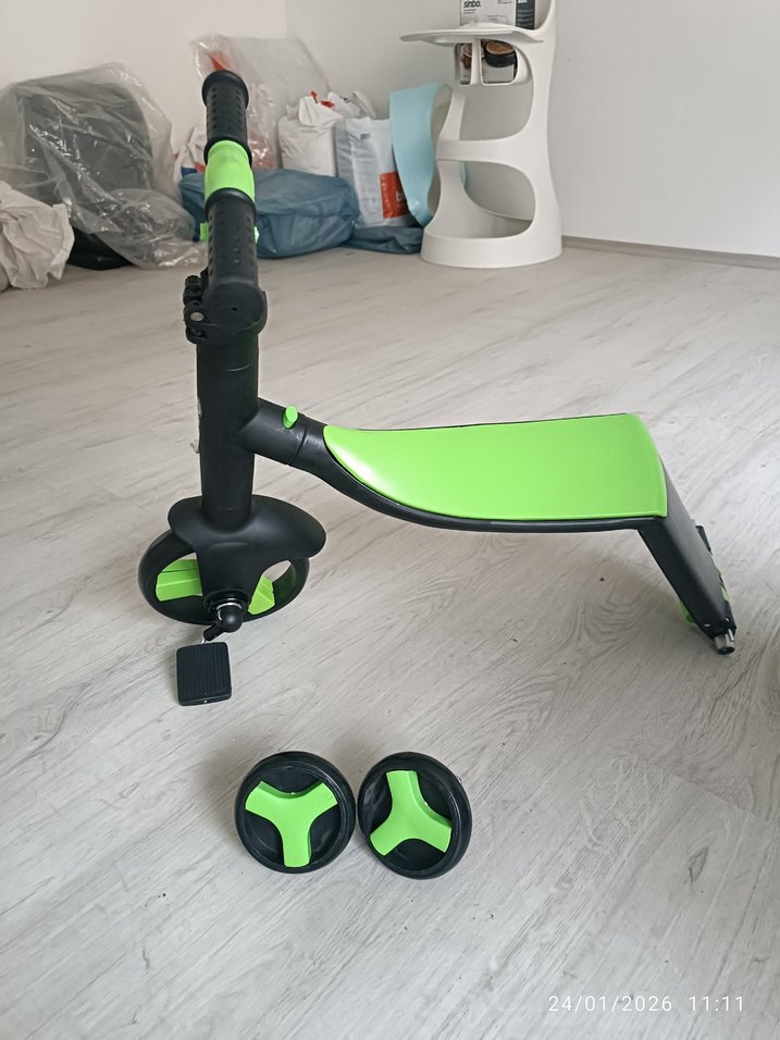 Renkli yeşil çocuk scooterı, sağlam çerçeve ve denge için üç tekerlekli yapıya sahiptir. Çıkarılabilir tekerlekler içerir. evde kullanıldı