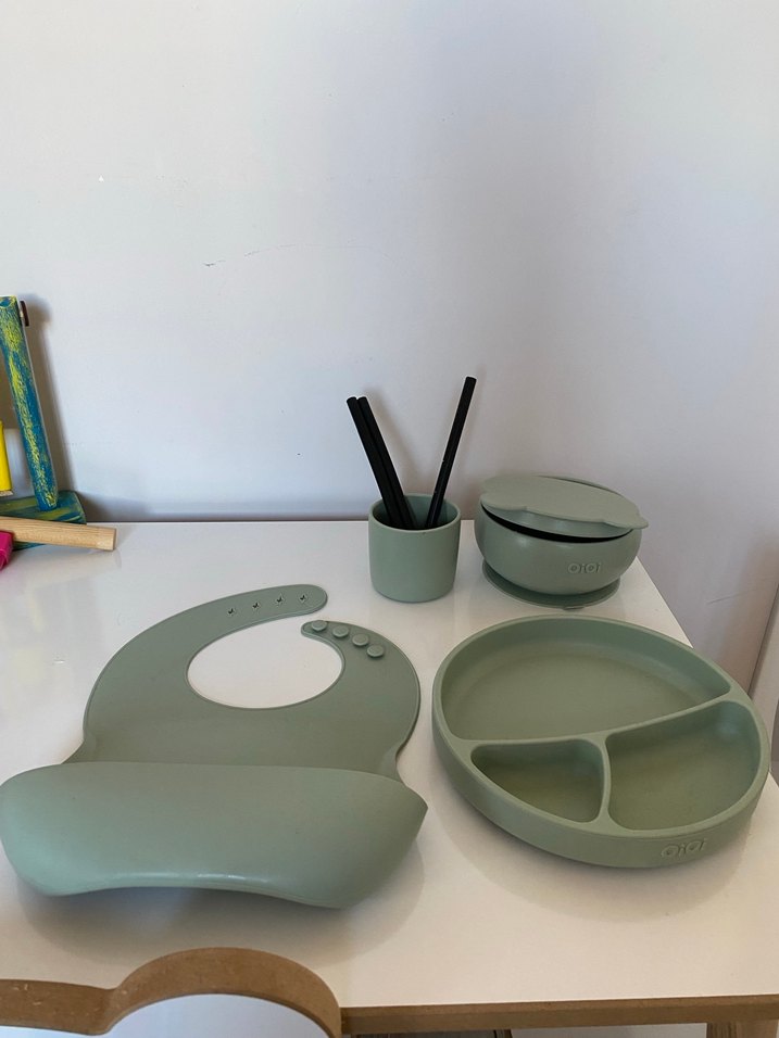Yeşil renkte bölmeli tabak, cep özellikli önlük, bardak ve çubuklardan oluşan çocuk yemek seti. ️