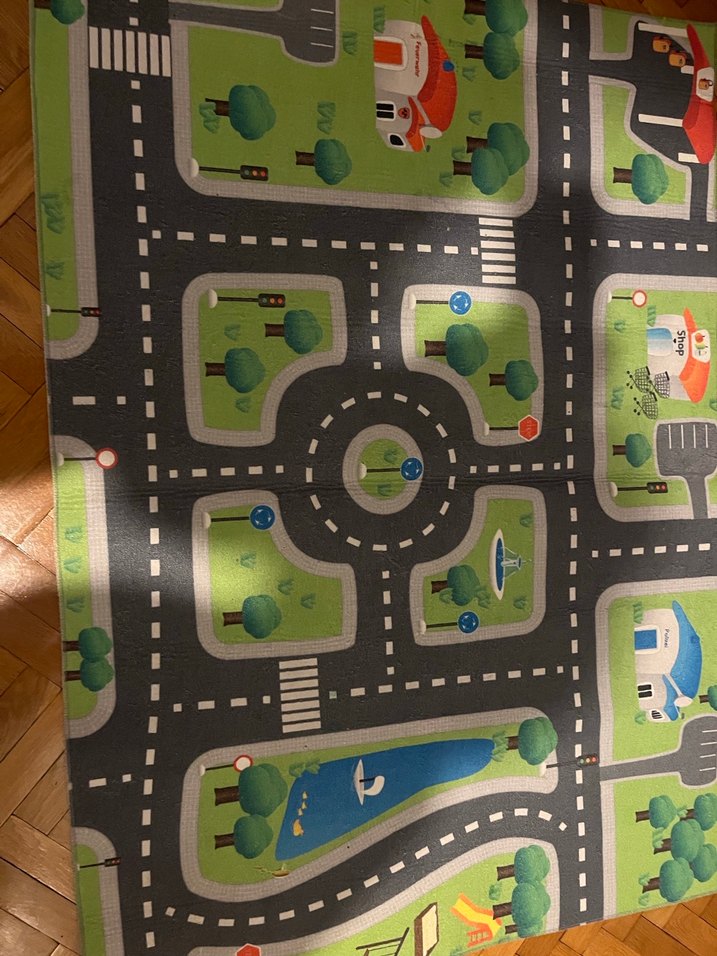 Yeşil ve gri renkte, yollar, ağaçlar ve oyun alanları içeren çocuklar için oyun halısı. 100 140