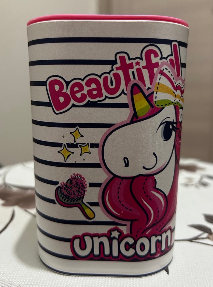 Pembe renkli, çizgili ve "Beautiful unicorn" yazılı unicorn desenli çocuk kumbarası. 8 adet mevcuttur ve görselleri yer almaktadır .
