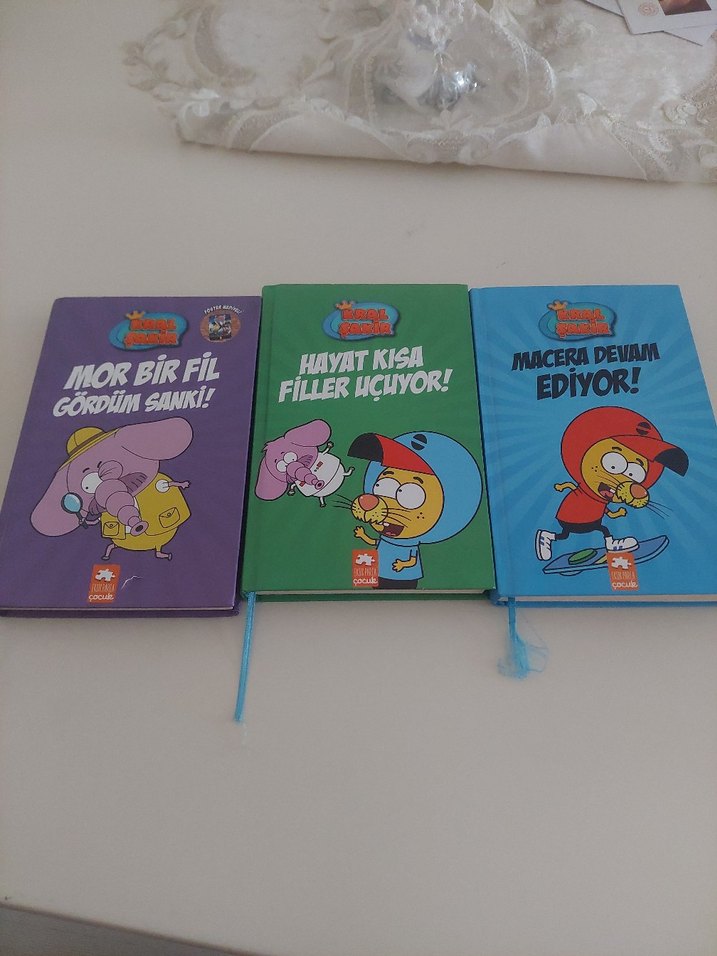 Mor bir fil karakterli, renkli ve eğlenceli üç çocuk kitabı seti: "Mor Bir Fil Gördün Sanır!", "Hayat Kısa Filler Uçuyor!" ve "Macera Devam Ediyor!".