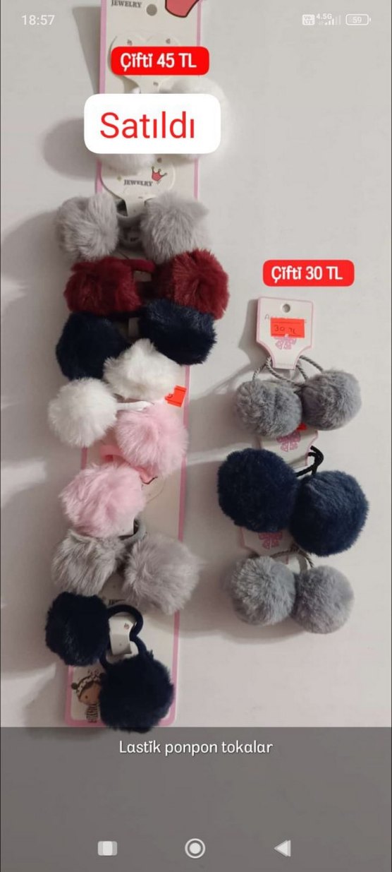 Çeşitli renklerde ve kürk detaylı, yumuşak ponponlu çocuk saç tokaları. Gri, kırmızı, lacivert, beyaz ve pembe tonları içerir.