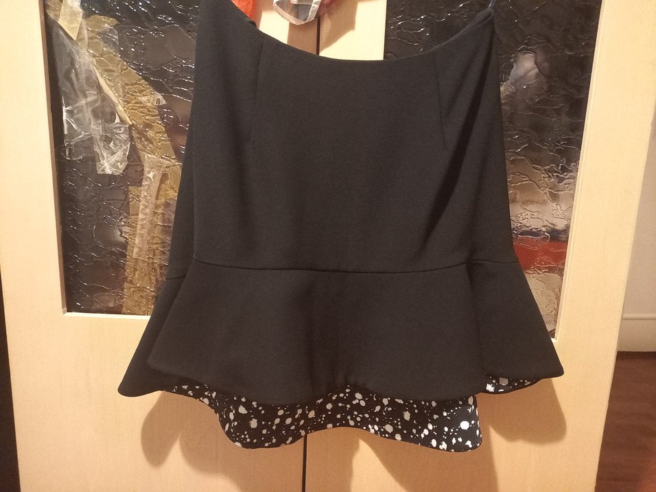 Parlak sentetik kumaştan, siyah renkli, fırfırlı ve vücuda oturan etek, romantik gece için ideal, gotik ve göz alıcı tarzda. eteğin önü arkasına göre daha kısa ön 36 cm arka 42 cm uzunluk. beli 31 cm small ... tertemiz bir etek