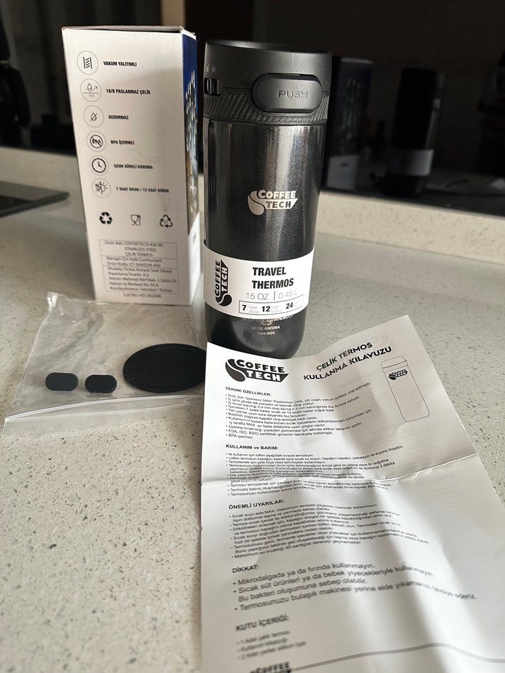 Kapasite: 450 ml 7 Saat sıcak 12 Saat soğuk 24 Saat buzlu Çift Cidarlı SUS 304 Paslanmaz çelik, çift cidarlı vakum çelikten imal edilmiştir. İç çelik gövde tek parçadır ve kaynak dikişi yoktur. İç duvar kalınlığı 0.4 mm olup ayrıca 0.5 mm kalınlığında dış duvara sahiptir. İçecekleri 7 saate kadar sıcak ve 12 saate kadar soğuk tutar. Yarı parlak uzun süre dayanıklı toz boyalıdır. Basmalı düğmeli kapaklı olup emniyet kilidi vardır. Kullanıcının kazara fazla konan sıcak içeceklerin dökülmesinden korunması için iç tarafta maksimum en fazla doldurma uyarısı çizgisi vardır. Üzerine bırakıldığı yüzeyleri çizmemesi için altında silikon tabanlık vardır. BPA içermez FDA, ISO, BSCI sertifikalı güvenilir üretilmiştir.