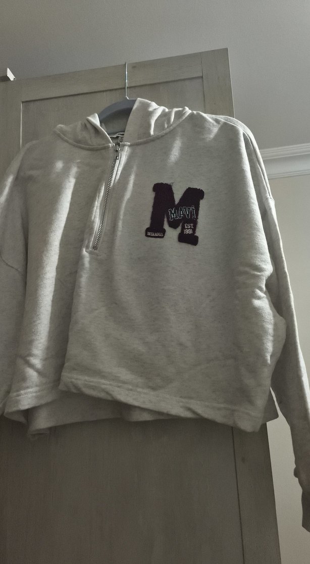Crop kapşonlu çok açık gri sweatshirt Mavi marka S beden iyi durumda