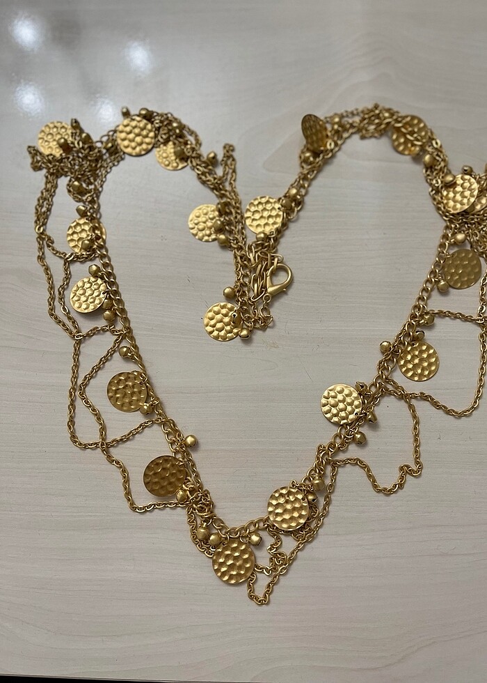 Emitasyon altin rengi aksesuar.ister bele ister boyuna takilabilir yada sade elbiseleri hareketlendirmek için de kullanabilirsiniz.Uzunluk Olçüsü-102 cm