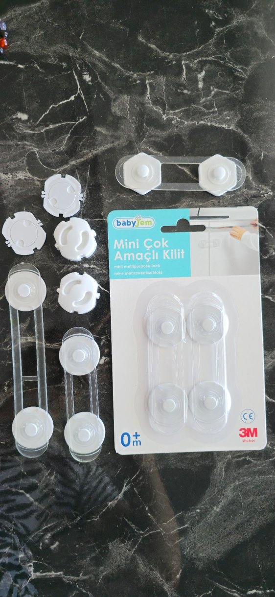BabyJem Mini Çok Amaçlı Kilit 2'li set, orinal ambalajındadır. Digerlerinin markalarını hatırlamıyorum. Evde priz, dolap, çekmece gibi alanlarda güvenkiği sağlamak için uygundur. ️Fiyata fotoğrafta görülen ürünlerin hepsi dahildir. Ürünler: 2 adet priz kapağı, 2 adet prizmatik, 2 adet mini boy kilit (8cm), 1 adet orta boy kilit (13cm), 1 adet 2'li kilit koruma (ambalajlı olan, 8cm).