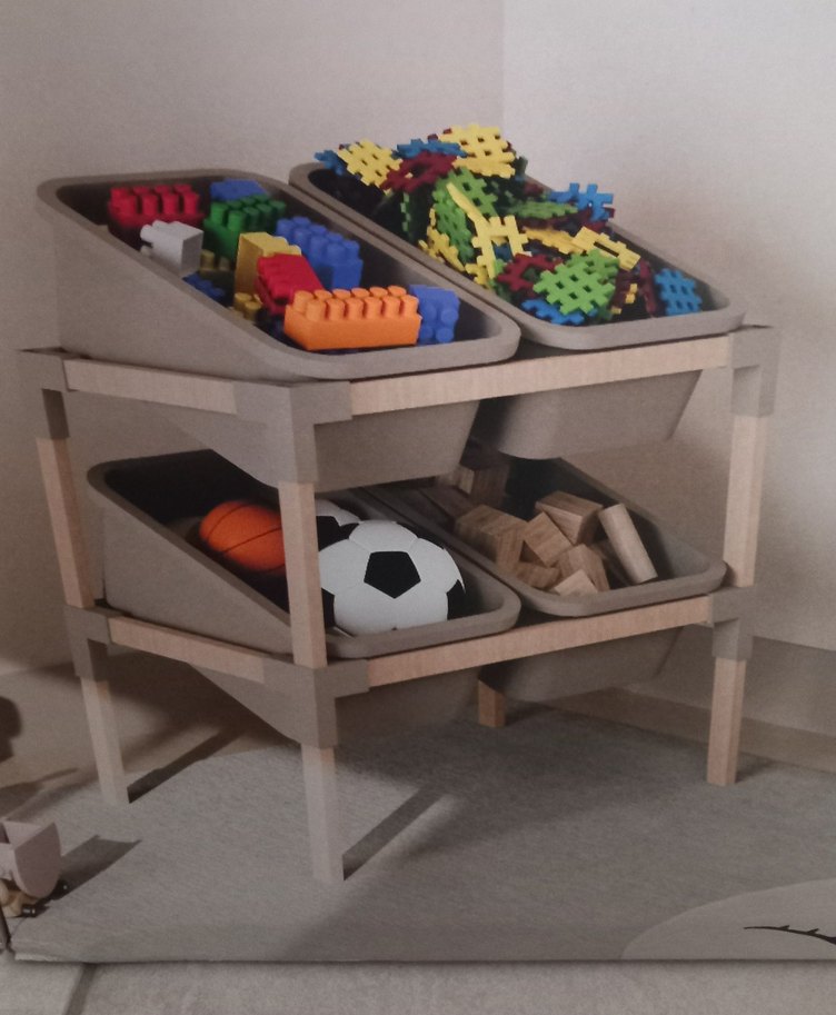 oyuncak düzenlemek için çoklu eğimli kutulara sahip ahşap ve plastik çocuk oyun mobilyası.