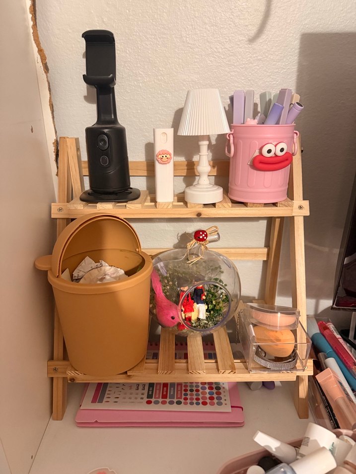 İki katlı, oyuncak veya kırtasiye düzenlemek için eğlenceli saklama kutuları ve küçük dekoratif öğeler içerir.