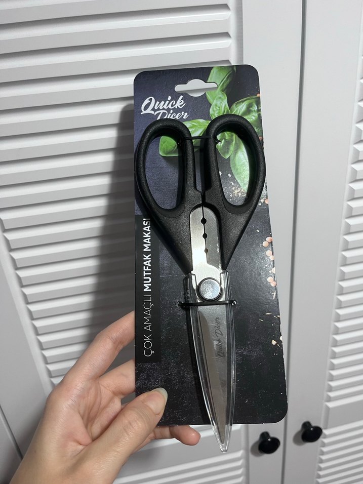 Ergonomik saplı, çok amaçlı siyah mutfak makası. Quick Dicer markalı, pratik mutfak kullanımı sağlar. ✂️