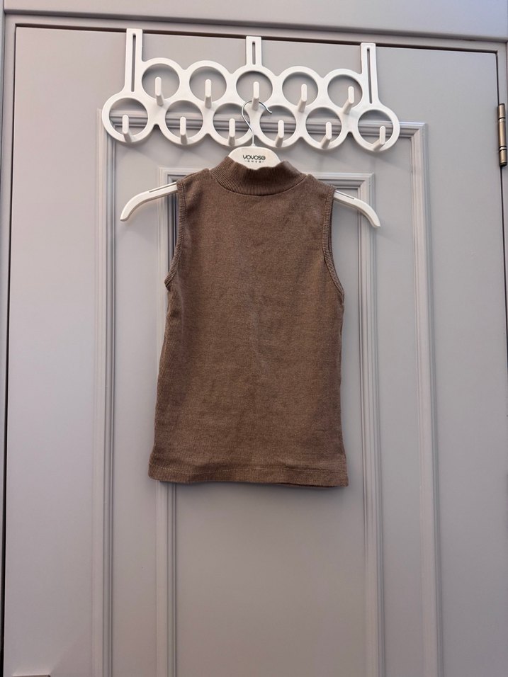 Yüksek yakalı, kolsuz ve vücuda oturan erkek çocuk yeleği, yumuşak keten kumaştan, sade kahverengi renkte, normcore tarzda.