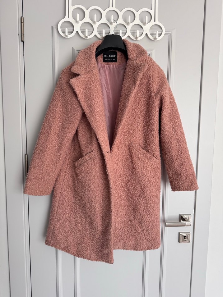 Yumuşak dokulu pembe peluş kaban, yaka ve iki ön ceple rahat bir iç astara sahiptir.