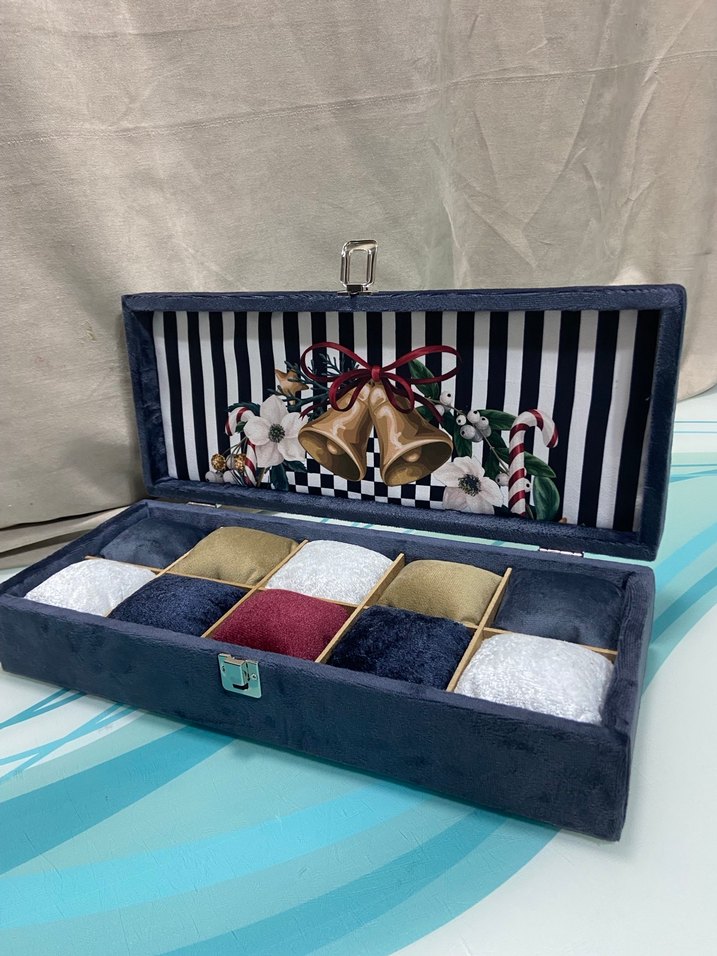 Çok bölmeli, yumuşak minderli koyu renkli saat veya küçük aksesuar kutusu. İç kapakta çizgili desen ve süslemeler bulunur.