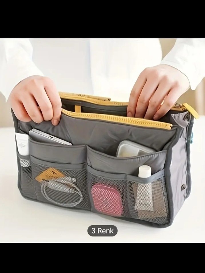 Gri renkte, fermuarlı, çok bölmeli ve file cepli kadın makyaj çantasıdır. Sentetik kumaştan yapılmıştır ve "3 Renk" yazısı bulunmaktadır.