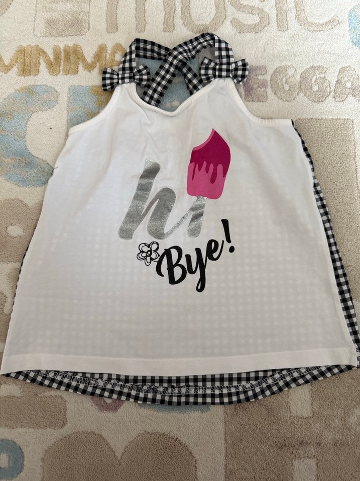 Pamuklu, kolsuz, V yakalı kız çocuk bluzu. Baskılı ve fırfırlı detayları, gri kareli desenle tamamlanmıştır. Sorunsuz kusursuz. 3-5 yaş arası diye hatırlıyorum. Ölçüleri resimlerde mevcut.