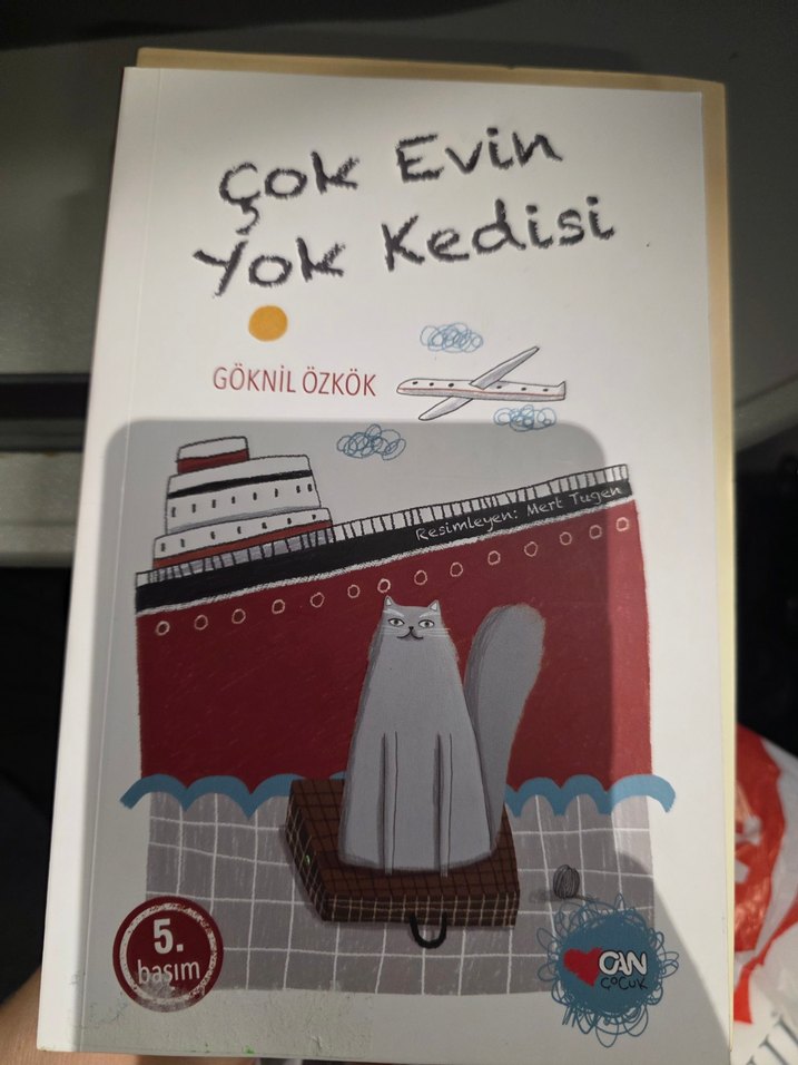 Göknil Özkök'ün Çok Evin Yok Kedisi kitabı, Mert Turan'ın çizimleriyle. Kapakta bavul üzerindeki kedi, gemi ve uçak yer alıyor. 5. basım.