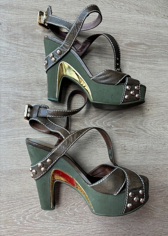 En sevdiğim tasarımcı ve son yıllarda renkli çantaları çok moda. Çok sağlam. Az bulunan bir renk ve tasarım. Haki. Bu yaz Beymen'de bu tonlarda ayakkabılar mevcut. Ben de zamanında Beymen’den almıştım. Tüm ayakkabılarım gibi lavantalı ve/veya sabunlu kutularda çok iyi muhafaza ettim. Artık topuklu giyemediğimden satıyorum. Fotoğraflara çok iyi bakın lütfen. Küçük kusurları (mesela içindeki pırıltılı tabanı silik, giyildiğinde hiç görünmüyor tabi ki) mevcut. Ama en alımlı görünen yerlerinde (çivi ve pırıltılı alan) yerlerde kusur yok.