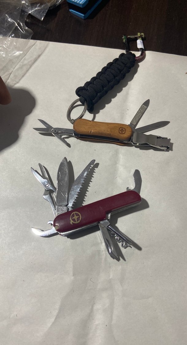 Çoklu bıçak ve araçlara sahip, koyu renkli çok fonksiyonlu cep bıçakları. Biri ahşap saplı diğeri koyu kırmızı saplıdır. ✂️