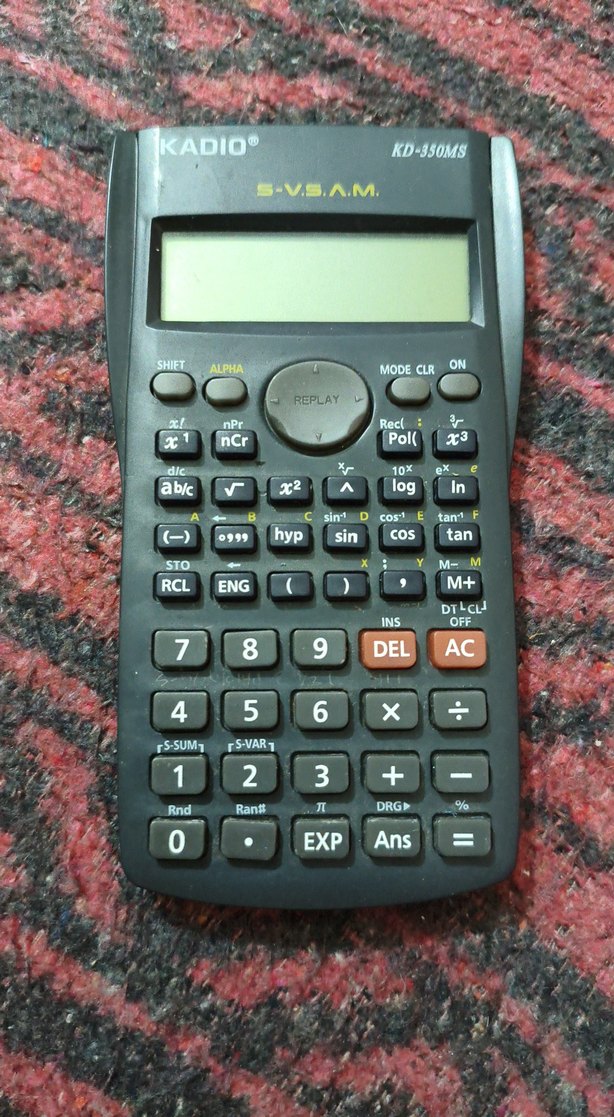 Gri renkli, fonksiyon tuşları ve ekranı bulunan hesap makinesi klavyesi, üzerinde DEL tuşu yer alır.