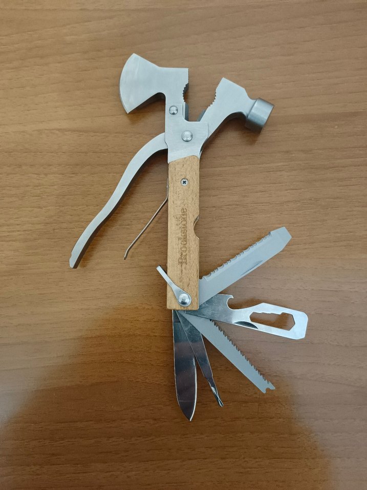 Ahşap saplı çok fonksiyonlu kamp aleti; küçük balta, çekiç, bıçak, testere ve açacak gibi metal aletler içerir. ️ 14'ü 1 arada Kompakt Çok Amaçlı Alet Çekiç ve Balta Kutulu, hiç kullanılmadı.