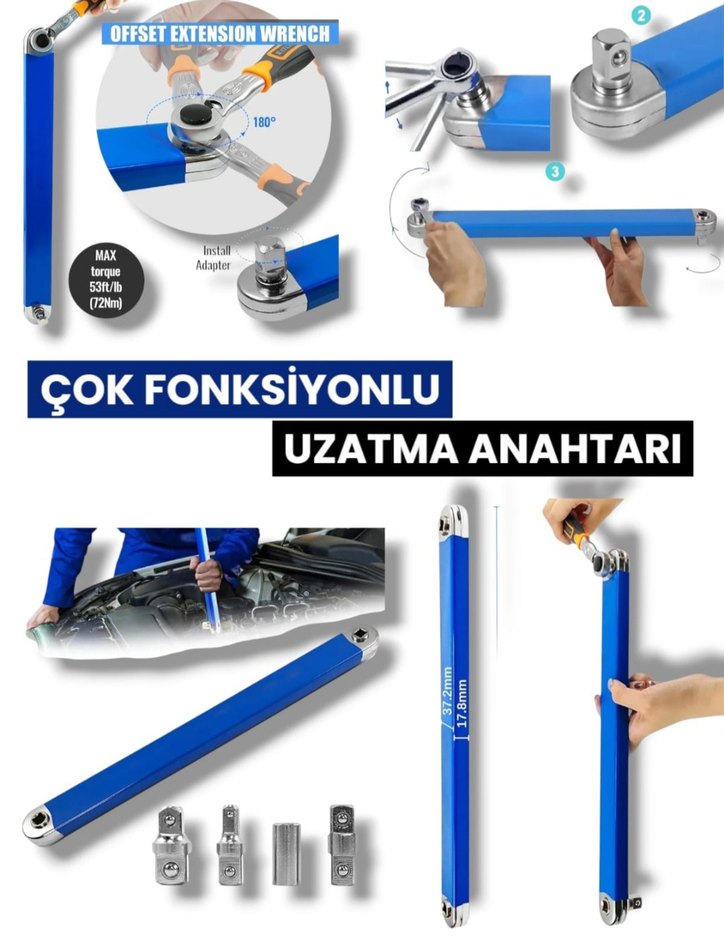 180° dönebilen adaptör ve çeşitli bağlantı seçeneklerine sahip mavi uzatma anahtarı, maksimum 53ft/lb (72Nm) tork sağlar.