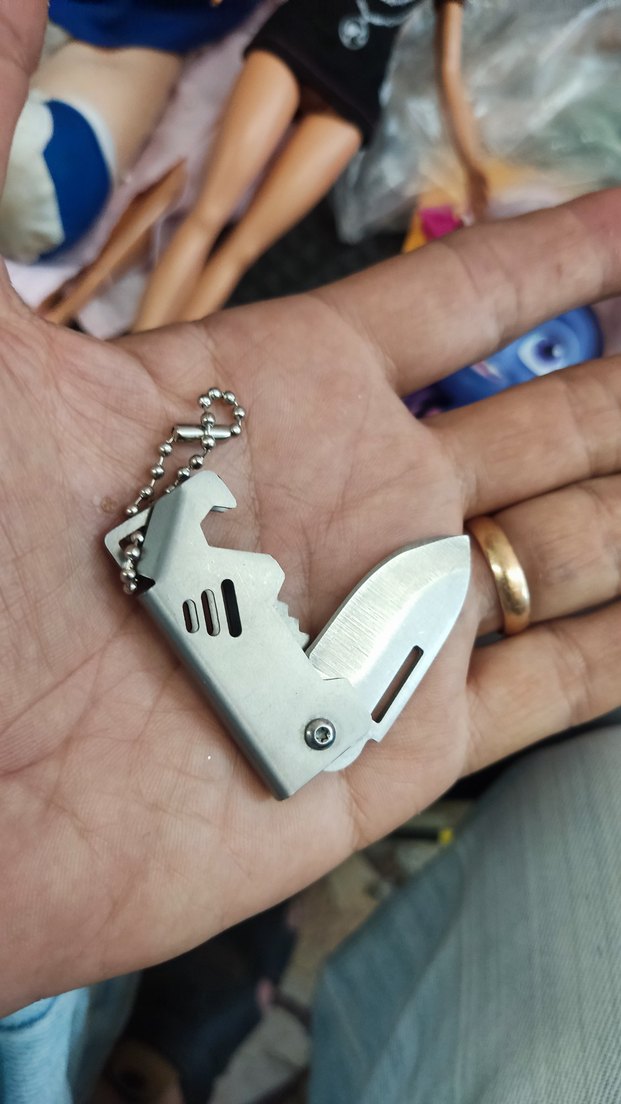 Küçük bıçağı ve çoklu fonksiyonları olan, anahtarlık şeklinde taşınabilen kompakt katlanır bıçak. Metal görünümlü ve top zincirli.