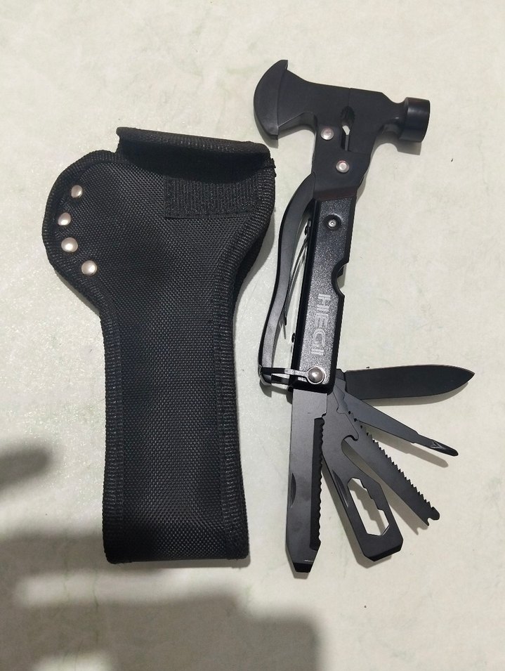 Çekiç, bıçak ve çeşitli aletlere sahip siyah çok fonksiyonlu erkek aksesuarı, kauçuk ve metal malzemeden, velcro kapaklı taşıma kılıfı ile.