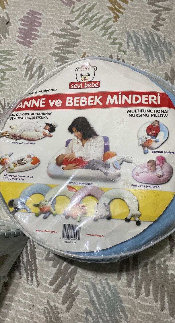 Pastel renkli baskılı çok fonksiyonlu emzirme minderi, anne ve bebek için çeşitli pozisyonlarda destek sağlar. Oyuncaklar içerir.
