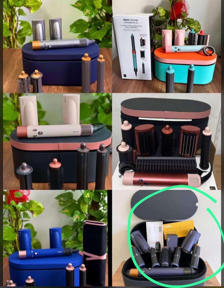 Koyu haki renkli saklama kutusuyla çoklu saç şekillendirici aparatları içeren set, çeşitli saç stilleri için uygundur.