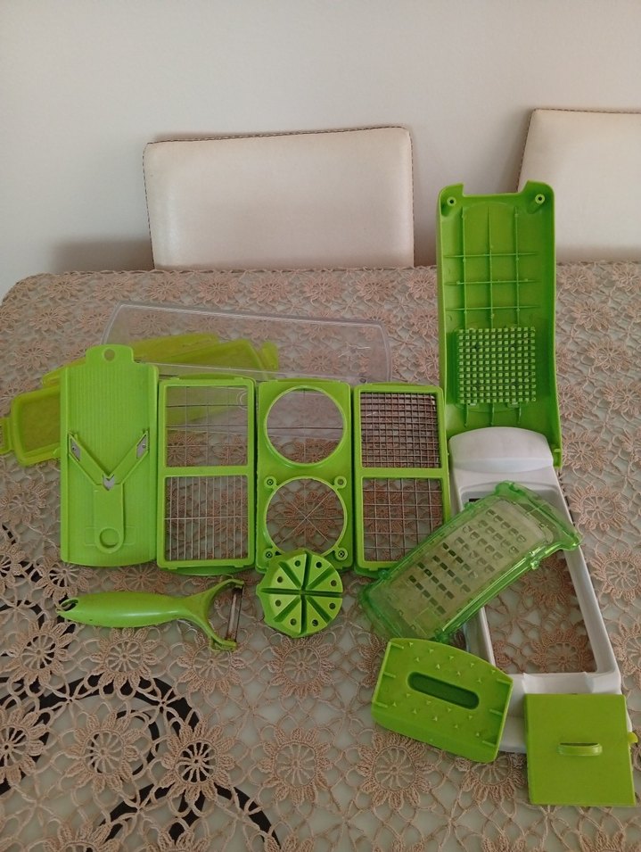 Çoklu bıçak ve aparatlarla dilimleme, doğrama, rendeleme ve soyma işlemleri için yeşil plastik mutfak rende seti.