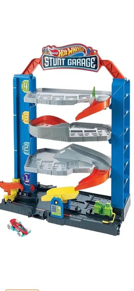 Çok katlı oyuncak araba parkı, renkli tasarım ve rampa detayları içerir. Üzerinde 'STUnT GARAGE' yazısı bulunur. Küçük oyuncak araba dahildir.