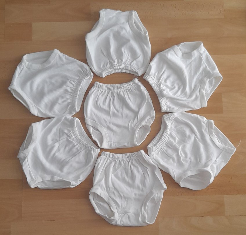 Yumuşak, elastik bel bantlı beyaz bebek iç çamaşırı seti. Günlük kullanım için sade ve desensiz tasarım. 6 ADET FİYATIDIR
