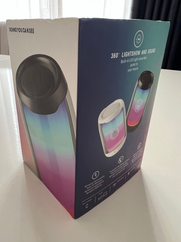 Çok renkli Bluetooth hoparlör, müziğinizle uyumlu 360° LED ışık gösterisi ve güçlü ses sunar. USB giriş mevcut iki şekilde şarj edilebilir