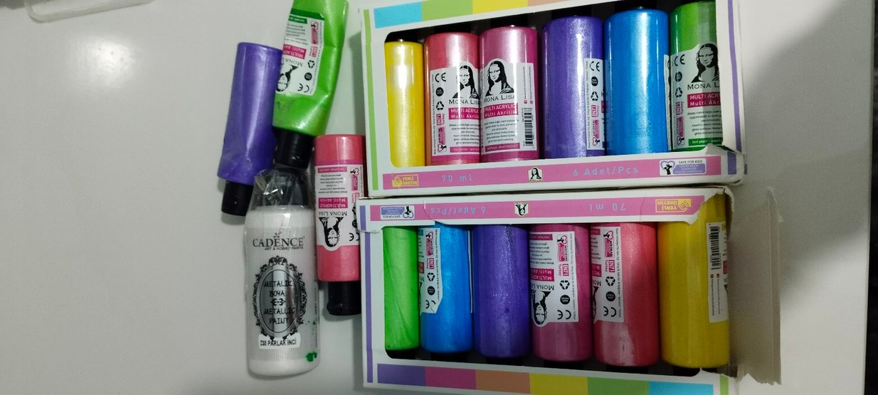70 ml'lik tüplerde çok renkli akrilik boya seti, çeşitli canlı renkler içerir. içlerinde 120 ml lik parlak incide var. Toplam 16 adet boya vardır. Sadece açık olan yeşilden az kullanıldı diğerleri yeni. elimdeki fazlaliktan dolayı satıyorum. hepsinden elimde 2 paket daha var.